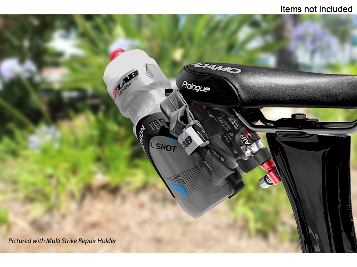 MULTI-STRIKE REPAIR HOLDER easily carries a clincher repair kit – tube, tire levers, XLAB AIR STRIKE CO2 Cartridges and XLAB inflator. It can also carry a full tubular setup including tubular tire and inflating foam sealant.